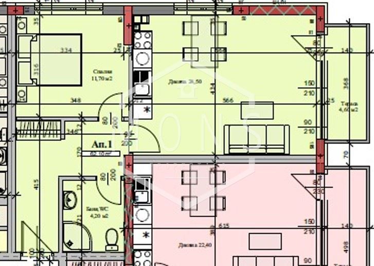 Обща площ на имота 69 кв.м. , като ЗП 60 е кв.м.