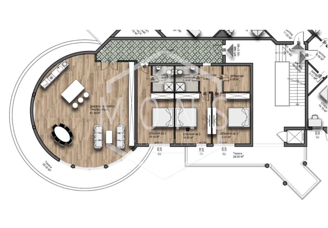Разпределението е както следва:Коридор, всекидневна с кухненски бокс, три спални, дрешник, две бани и тоалетни, тераса.