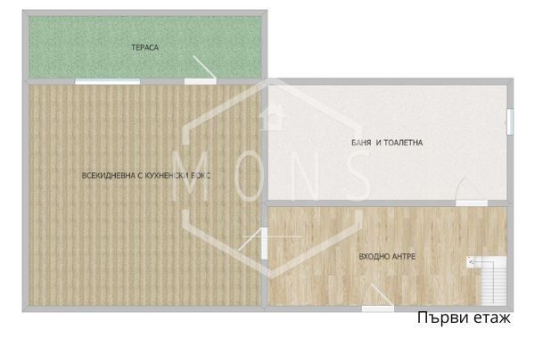 -Първо ниво: коридор, всекидневна с кухненски бокс, тераса и баня с тоалетна.