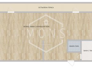 Състои се от антре,просторна дневна с кухненски бокс, остъклена тераса с гледка, баня с тоалетна и стълбище от ковано желязо към горния етаж.