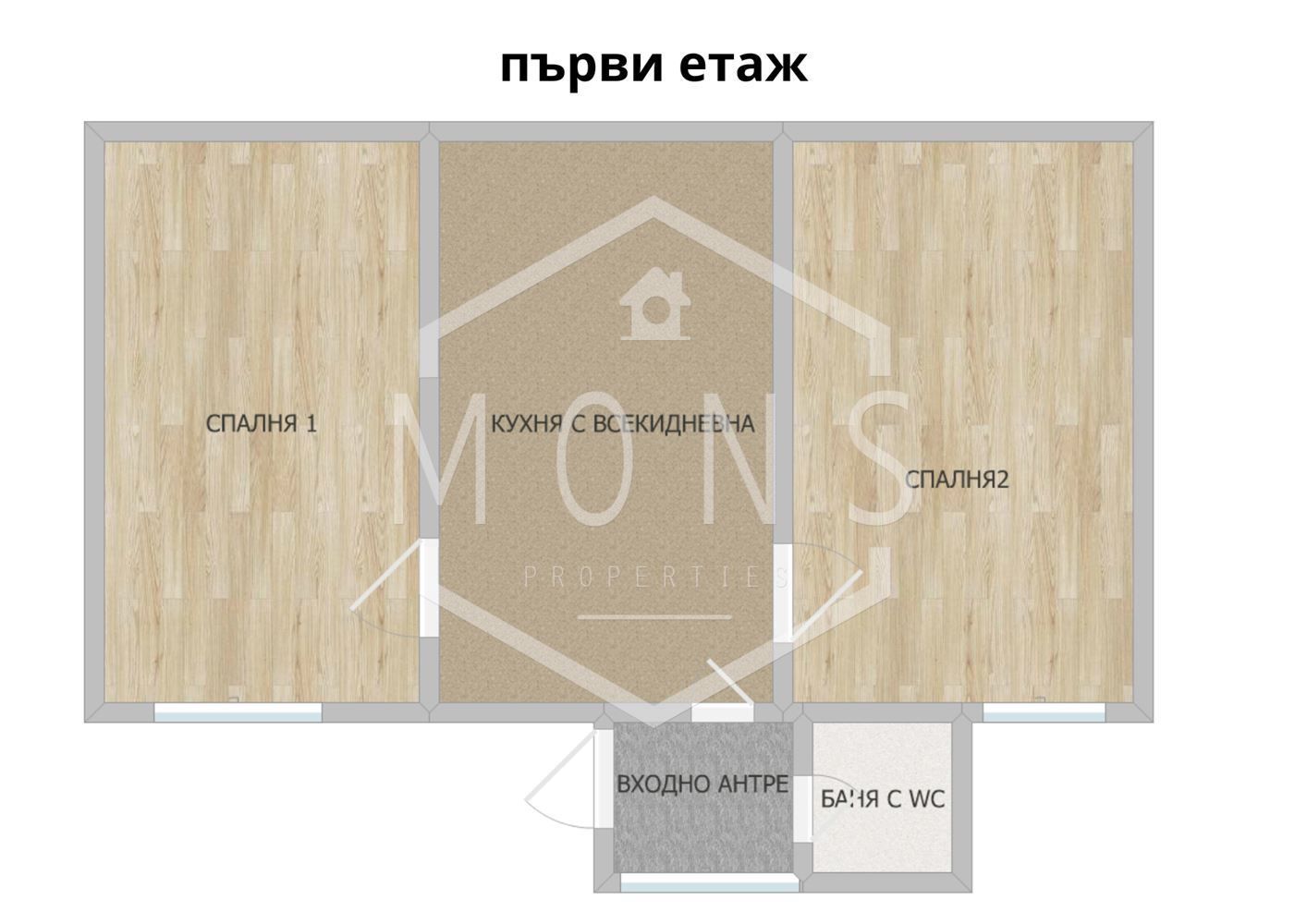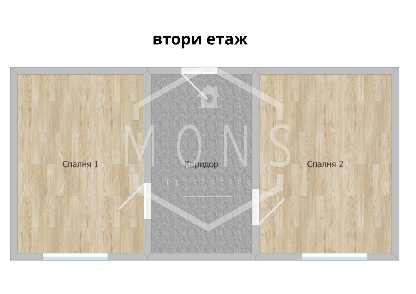 -Първи етаж: входно антре, всекидневна с кухненски бокс, две спални, баня с тоалетна.