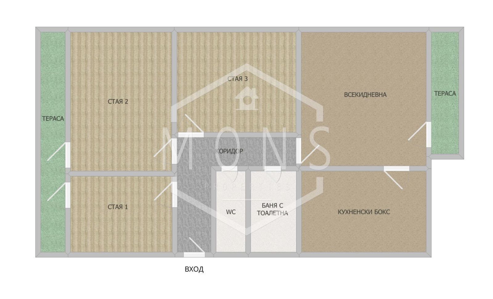 Предимства на имота - светли стаи, практично разпределение, добър потенциал за модернизация според вашия стил.